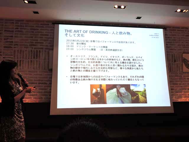 さて,プレス発表会は,レイカート・ケッテルハーケ観光局長などの挨拶のあと,“いつもの”西山さんによる内容の濃いプレゼンテーションが続いたが,今回は,さらにその後に東京ドイツ文化センターの堀口典子さんから,ドイツ文化センターの歴史や日ごろの活動紹介,そして5月22日(金)にドイツ文化会館で開催されるイベントが発表された.それはオーストリア,フランス,ドイツ,イタリア,ポーランド,スペインのヨーロッパ6カ国と日本から,飲み物や飲むという習慣の文化的,社会的背景について共に考える機会を設けたものだという.題して“人と飲み物、そして文化”.