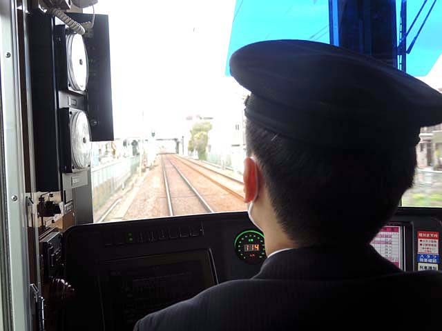 神崎川を過ぎると,高架化工事が進捗し,神崎川橋梁も架け替えられて列車撮影には条件が厳しくなっている様子が看て取れたが,“飛ばす”ための条件は向上したともいえる.神崎川を過ぎると,ほどなく速度計の針…ではなく表示が114キロを示した.かつて“大阪の省電”に収録した,谷川義春さん撮影になる,疾走する流電の運転室から前方を見た写真をイメージしながらの撮影となった.