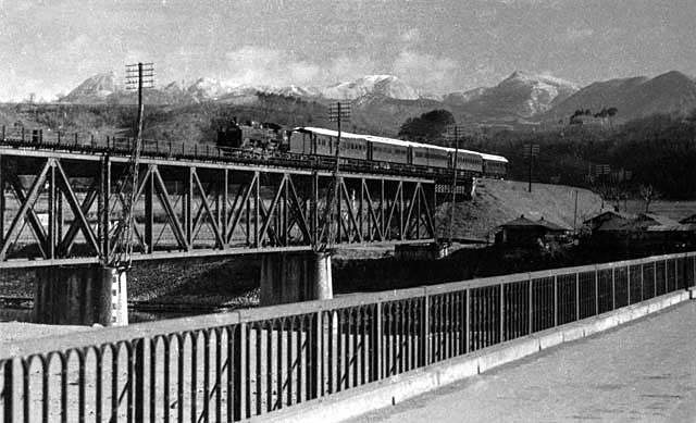 上越線渋川付近の利根川橋梁を駆け下るC57.今も変わらぬ名撮影地の,もっとも古い時代の写真かもしれない.なにより雪をかぶった山々と客車の取り合わせ,そして手前の道路橋…大正橋…の欄干を取り込んでの構図は,とても偶然の産物とは思えない.印画紙からの製版なので紙目などがでているが,そんなことは問題ではなく作品に惹き込まれてしまう.昭和22~23/1947~1948年頃 写真:佐藤 久