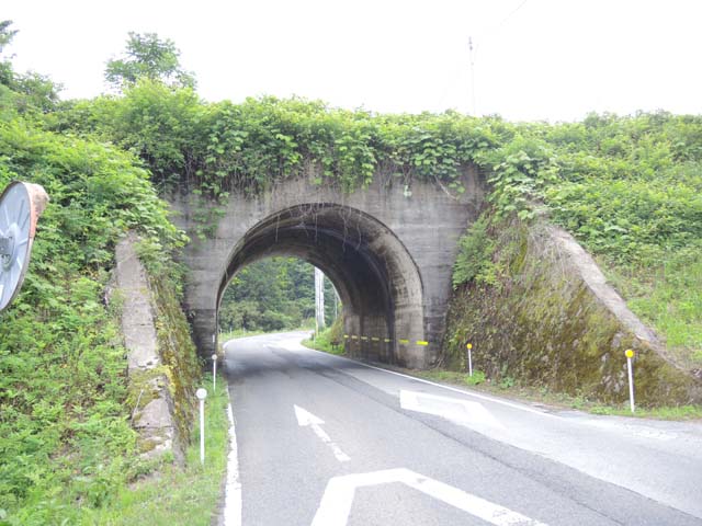 それは茂木町の県道27号線を南へ向けて走っていたところで,目の前に突如として現われた築堤.これはどう見たって,鉄道のための築堤である.下を潜る県道のポータルはコンクリート製の立派なもので両側の擁壁は丁寧な施工の石積み.残念ながら銘板は存在しなかった.