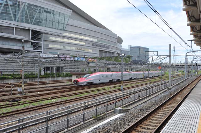 すぐ後をやってきた京浜東北線の電車に乗って,さいたま新都心駅へ.予想通り,列車は幅の広い跨線橋の下に停まっていた.だから肝心のE6系電車の多くの部分が影になってしまう.なので,ここでは発車ねらい.