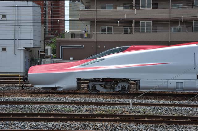 列車後部.E6の先頭部をほぼ真横から見る.時速320キロでの運転を実現するための苦労がしのばれる造形.400啓八重3系と比べれば中間車も随分小柄に