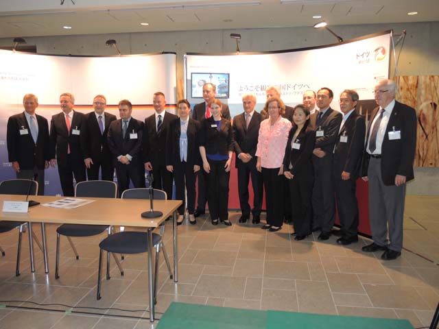 ワークショップに参加した各観光局や観光街道協会,ホテルチェーンなどのメンバーが記念撮影.記者会見の会場は,昨秋に続いてドイツ大使館のアトリウムだった.