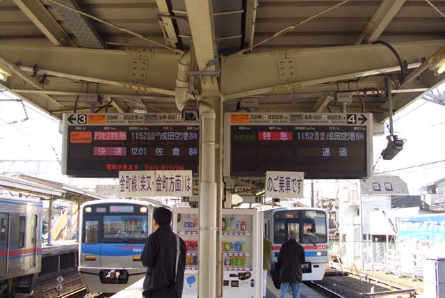 そ して中継地点としての京成高砂駅に降りたったのは5年振りぐらいだろうか.建設中だった金町線の高架は完成し,ホームは?と探したら改札が別になっていて 驚いた.そして成田方面行きのホームで見たのは,同時刻発の同じ成田空港行き特急の案内表示.片や京成線経由,片や新線経由というのは,予備知識があれば わかることだけれど,でも,一瞬??となる.