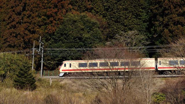 深い緑にクリームと赤帯の車体が映えて……と思っていたのだけれど,よく見ると,杉の木立の多くは,緑でなくて茶色.杉の花が,実に満開状態なのだった.俳句の春の季語といえば風流だが,ここ数十年は“花粉症”の現況として忌み嫌われる,可哀想な存在.