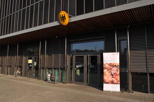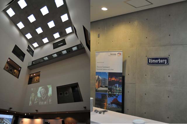 現在の大使館事務棟は2005年に新築された現代的デザインの建物.会場となったアトリウムは5階まで吹き抜けのさわやかな空間だった.コンクリート打ちっ放しの壁には“Römerberg(ローマ人の山)というプレートがあった.これは,今年8月16日付けの,大使自身のブログによれば,改築前の建物のなかに存在した館員のための憩いの場に,だれともなく付けた名前で,新しい建物にもようやく復活したのだそうだ.普段はこのプレートの前にコーヒーメーカーなどが据えられ,休憩の場となっているとのこと.