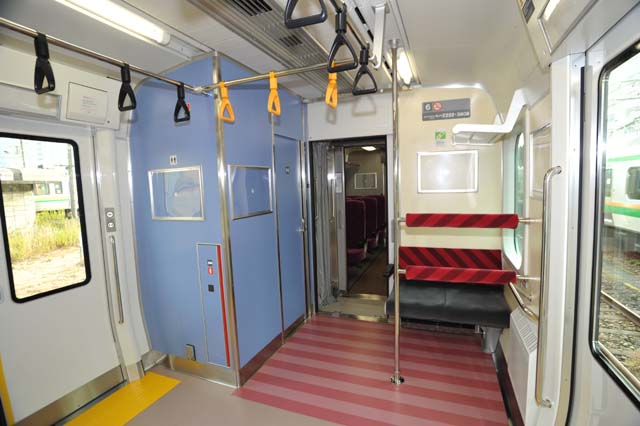 そのトイレ部分.トイレの向かい側(山側)には枕木方向に腰掛が設けられている.ちなみにここは優先席.