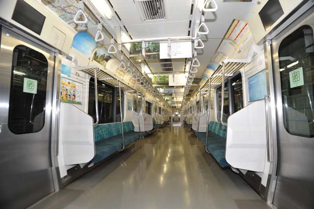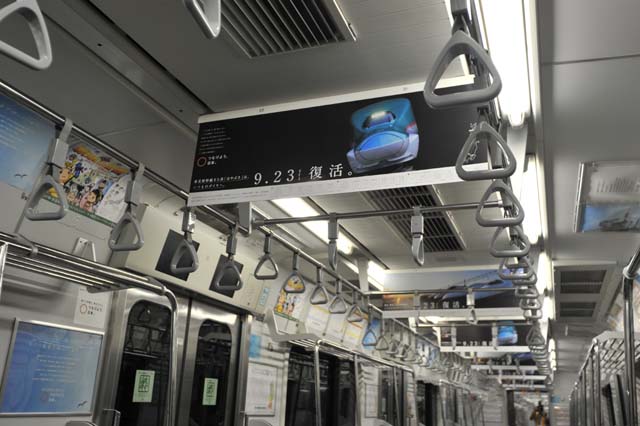 それだけではないのがこのラッピング編成の特徴.車内の中吊り広告も天井や戸袋,妻板などの広告枠すべてが“東北~キャンペーン”関連の図柄に統一されているのである.