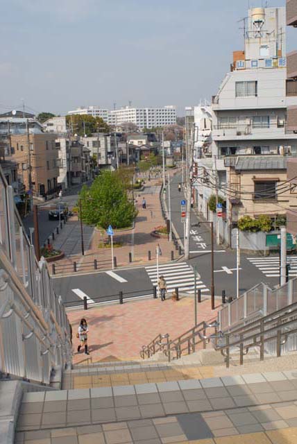階 段で高架橋にあがると,そこはもう,れっきとした遊歩道.線路跡という面影は薄い.なぜだろうと考えてみるに,まず,鉄道線路時代の側壁が完全に取り払わ れていること,架線柱がないこと,そして渋谷…東白楽方は階段で地上へ降りるようになっているからではないかと思われる.