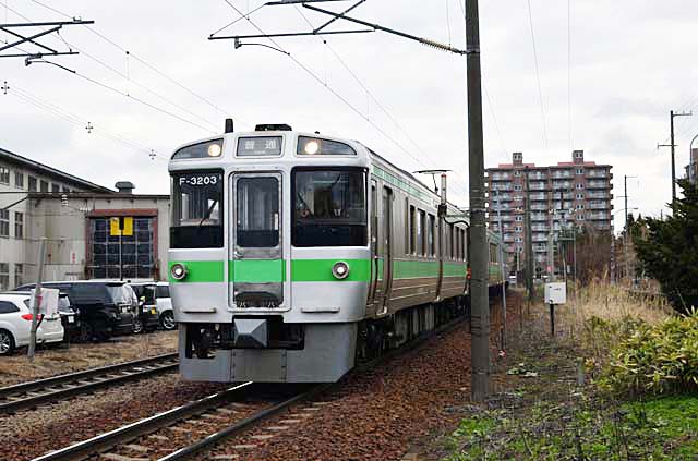 報道公開が行なわれた札幌運転所最寄り駅の稲穂駅に到着する721系電車.1988年から数次にわたって増備された,ヒット作(?).しかし今ではJR北海道の一般形電車としては最古参となった.写真は1992年から製造された6輛固定編成バージョン.