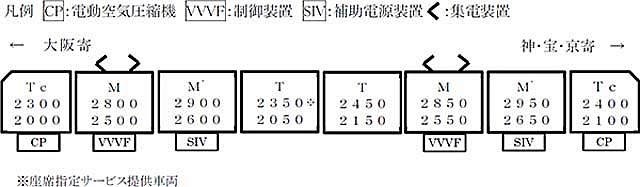 車号の上段が2300系,下段が2000系である.せっかくだから京都線用を通勤車の2代目ではなく特急車2800系の2代目にとすればよかったのにと思ったのだが,そうでない理由が,この編成表で理解できた.写真:阪急電鉄