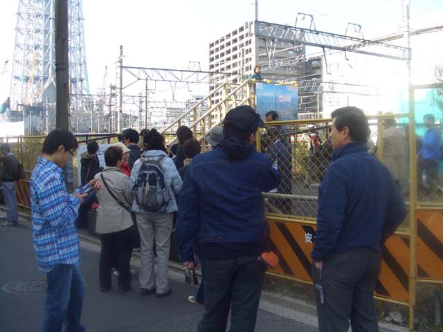 踏切脇の撮影広場とお立ち台.日に日に高くなるスカイツリーを撮影するには,11月末時点では既に苦しく,おまけに,目の前に架線柱の支持ワイヤーがあって,いわゆる鉄道写真にはちょっと不向きだった.最寄り駅は京成電鉄の押上.