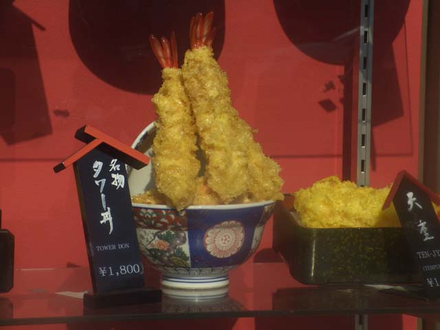 大きな海老の天ぷら3本を組み合わせてスカイツリーに見立てた“タワー丼”.思わず食べに入りそうになったが,日射しがどのように変るか判らない撮影中とあっては,諦めざるをえなかった.捲土重来.お店の名前は“更科 かみむら”値段は1,800円.