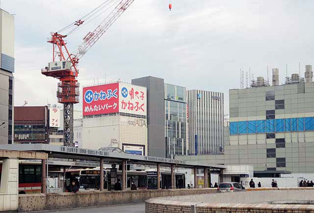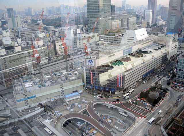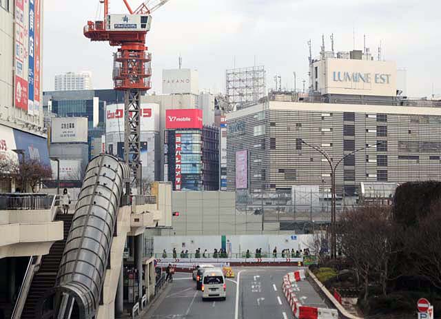 そして画面のほかの部分でも解体や建設工事がたけなわ.京王百貨店の並びは去年から解体中の小田急百貨店.駅前広場を挟んで右手は元の明治安田生命保険のビルが高層ビルに建て替え中.画面から外れた手前足元には,かつてスバルビルがあって,長らく空地だったが,先日からなにやら工事が本格化している.なんでも,地下駐車場への新しい出入口に変身するのだそうだ.