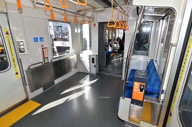 客室は,03系時代と同じようにも見えるが,実際には照明装置はLEDであり,多目的スペース(フリースペース,車椅子スペース)にはヒーターや非常通報装置が取り付けられている.