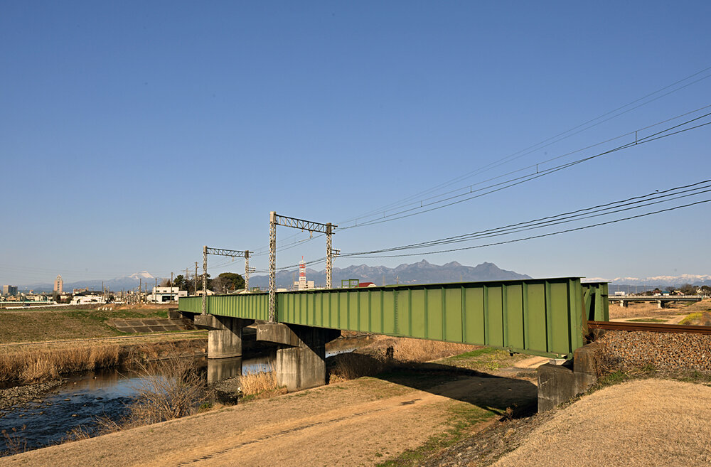 妙義と浅間と榛名と,そして谷川連峰.手前,桃ノ木川に架かる下路桁は昭和40年3月のトピー工業製.銘板にはKS-12,支間31.4m,傾斜角48度37分とあった.