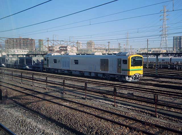 八高線の気動車置き替え用などでは,あるはずもなく,最新のバラスト輸送専用車である.あれ?奥の方に見えるのはEast i-E?