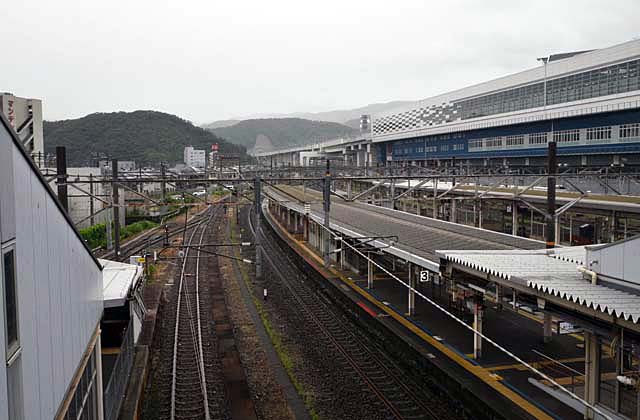 改札を出る前に撮影しておいた在来線ホーム.大きくカーブした,長い長いホームは往年のまま.後ろにそびえるのが高さ37mだという(どの位置の寸法だろうか)新幹線ホーム.そのホームが途切れた先の高架下辺りが,もとの第一機関区に当たるのだろうか.