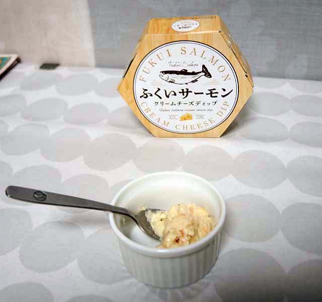 別の棚で目に入ったのが,“ふくいサーモン”.のクリームチーズディップ.トーストや野菜などのスティックに合わせて…….写真は帰宅後の撮影である.