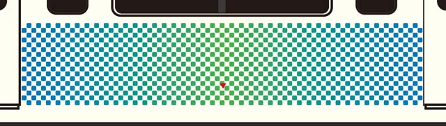 側面の市松模様拡大図である.画面中央下部の赤い逆三角形はドアコックの位置を示す表示.写真:西武鉄道