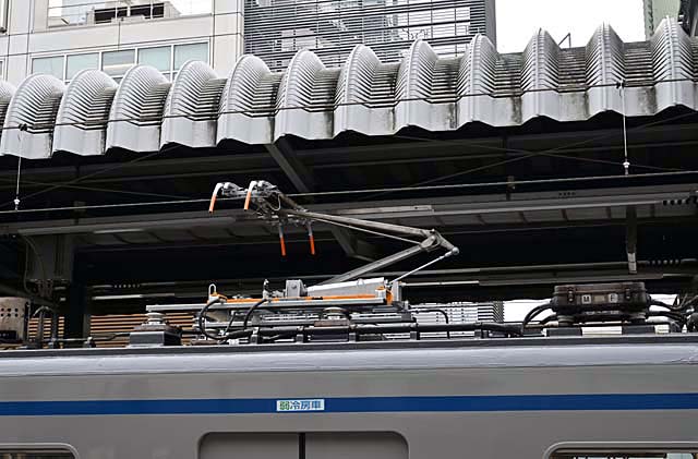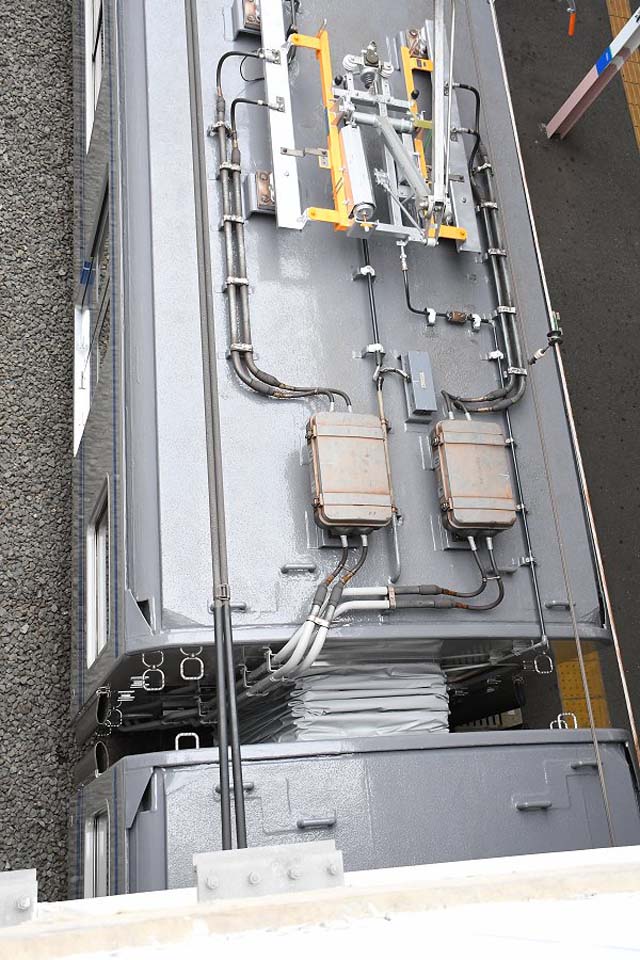 パンタグラフのクローズアップ.ホーンが2本のタイプ……40000系と同じようにみえるのだけれど,取り付け位置は少し高いような気もする.新品であるようだが,銘板は見えない.反対側に取り付けられているのか? 形式を確かめたかったのだが.