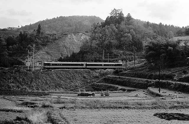棚田の途中から見た54年前の撮影ポイント.新スナックカーの,ちょうどスナックコーナーの辺りの線路端に,安全に近づくことができた.モノクロ写真はペンタックスS2,Super Takumar 55mm f1.8.フィルムは……