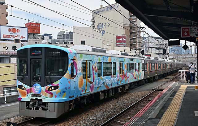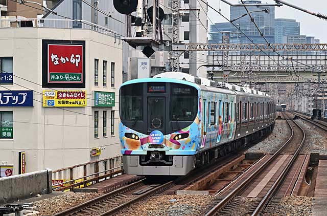 駅に到着してすぐ,“エキスポライナー”がやってきた.ラッピングされているのは323系のLS12編成のクモハ322-12.画面奥に普通の環状線の323系がこの列車を追いかけてくるのが見える.
