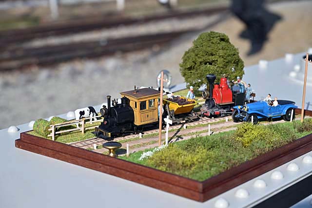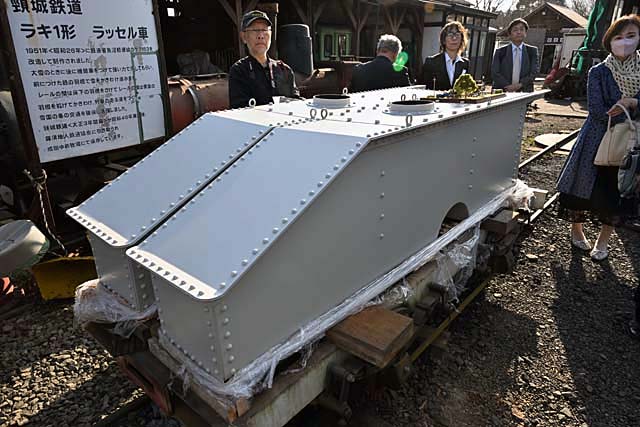 機関庫にはこんな部品も……きちんとしたリベット工作で仕上げられた,ドコービルの新しい側水槽である.動態復活は果たしたけれど,維持はずっと続くのである.水槽の上に載せられていたのは…….夢の情景であった.所有は角田幸弘さん,製作は西村慶明さん.