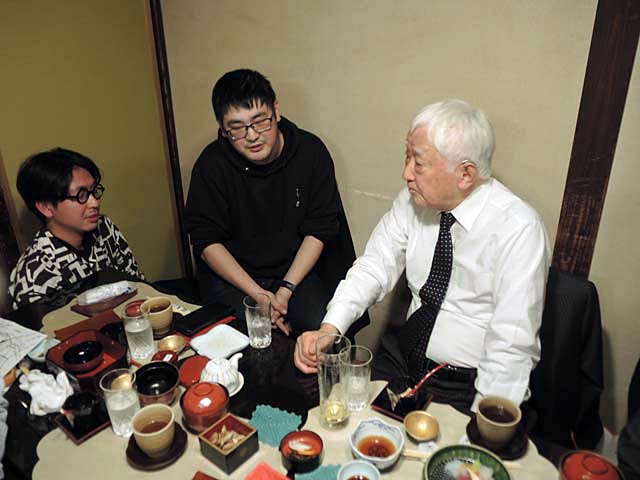 角田さんの発案により,新勝寺の参道に並ぶ鰻料理屋さんの一室に場所を移して…….羅須地人鉄道協会の,そして日本の鉄道趣味の次代を担う若手たちは,宮田さんからどんなお話を授かったのだろうか…….左は櫻井唯貴さん,右は山田翔太さん.