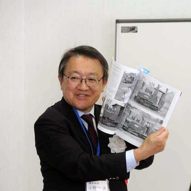 受賞理由を解説中の選考委員会委員長,小野田滋さん.開いているのは宮田さんの稿の頁だが,もちろん高橋さんの動態復元の稿についても詳しく解説してくださった.