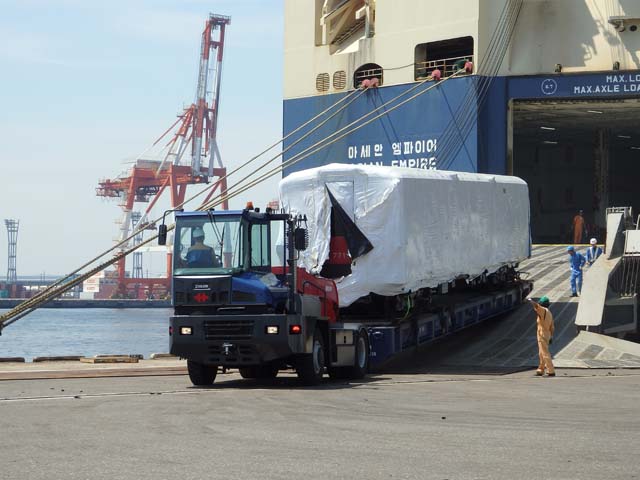 韓国籍の車輛運搬用貨物船“ASIAN EMPIRE”から上陸する500形.中野工場まではトレーラーによる陸送によるわけだが,どのようなルートが採られるのだろうか.写真:東京地下鉄