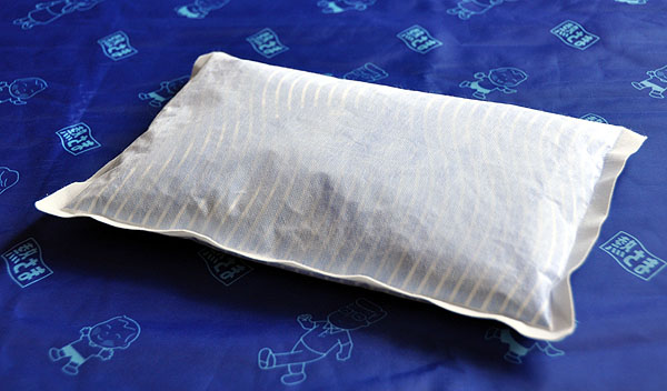 その中でも特にお気に入りはこのソフトまくら↑中にシリカゲルが入っている,ふわふわの枕です.ジェルタイプの冷却剤とは違って,結露することがなく,サラサラなのが特徴で,心地よい冷たさが持続します.これは冷凍庫で5時間以上冷やしてから使います.