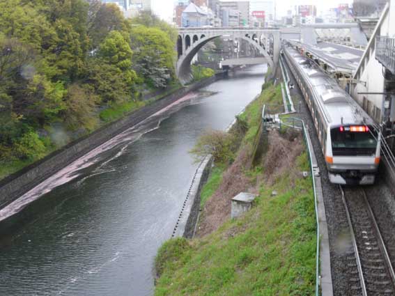 そして今朝.出勤途中のお茶の水で,散った花びらが神田川に綺麗な模様を描いていたので,雨空の下,無理矢理撮ってみました.