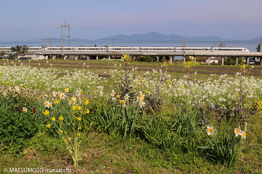 琶湖と線路が見えてきて突然畑が広がります。車を止めてウロウロしていると、小さいですがお花畑を発見。琵琶湖の撮影前にチョツトだけ春を撮ることにしま