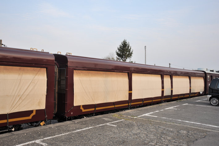おまけ。運行が終わり、トロッコ車が大間々駅に置かれている図。こんな風に窓を塞いでるんですね。