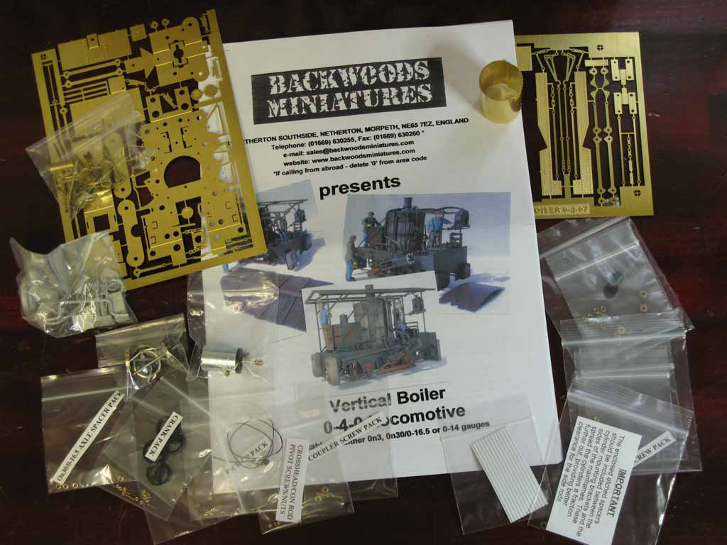 英国バックウッズ・ミニチュアのバーチカルボイラーBタンク機キットです。要するに英国式のエッチング抜き、ソフトメタルパーツ主体に、一部ロストワック スという構成なのですが、動輪はバラバラ、ロッド類やギヤーボックスも0.38t真鍮板エッチング抜きという代物なので、私の基準からすると、このあたり は作り直しですね。