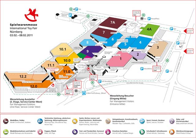 会場全体図.ホール11とホール1の間のスペースが地下鉄駅に隣接の中央ゲート.鉄道模型はホール4aで展開される.Photo:Spielwarenmesse eG Nürnberg
