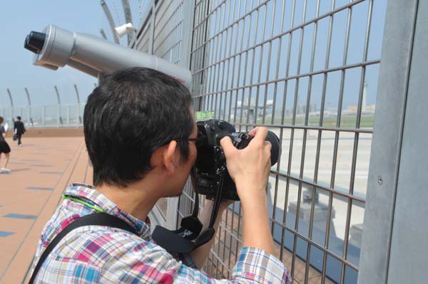 広々とした展望デッキ.金網の所々には,わざと穴を大きくした部分がある.ご覧の通り,カメラのレンズを通すためのサービス.世界各国の空港で同じような配慮を見ることができる.鉄道の跨線橋などで,このような計らいをしてくれる事業者があってもいい.