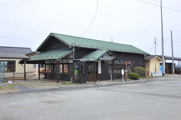 改札口を,木造だった沢辺駅から移植するなど,クラシカルな装いに整備された若柳駅本屋.画面右に貨車が,左奥に電車が見える.